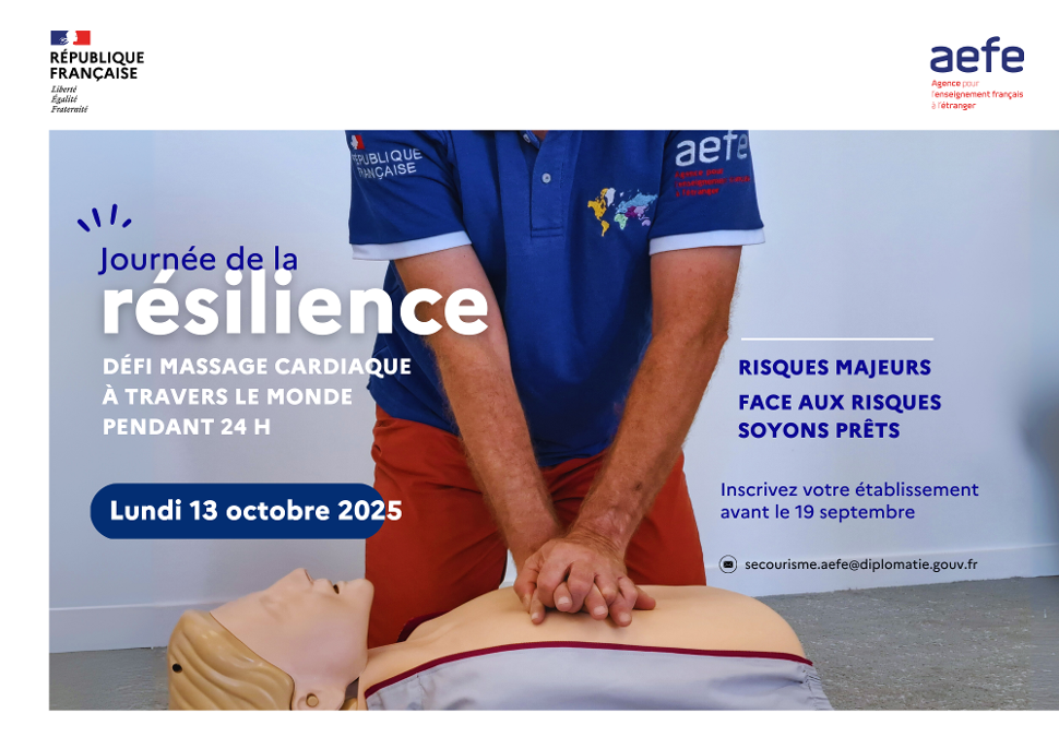 Dans le cadre de la 4e édition de la Journée nationale de la résilience, qui se déroule en cohérence avec la Journée internationale pour la réduction des risques de catastrophes de l'Organisation des Nations Unies, l’AEFE invite les établissements du réseau d’enseignement français à l’étranger à participer à un défi : faire un relais en réalisant un massage cardiaque sur mannequin pendant 24 h en continu.